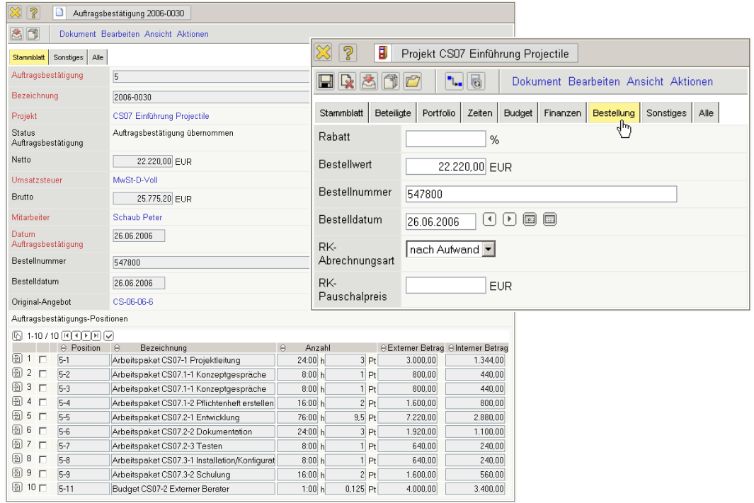 Die Maske Auftrag verwaltet die Bestellungen des Kundens. Nach Annahme eines Angebotes, können die Bestelldaten entweder direkt in das Projekt eingeben werden oder eine Auftragsbestätigung angelegt werden. Diese Auftragsbestätigung ist notwendig bei Projekten, die nicht wie angeboten bestellt werden.