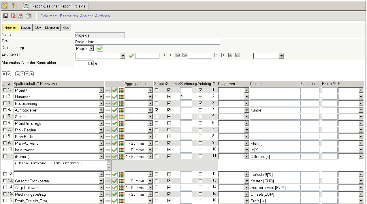 Mit Hilfe des Report-Designers können bestehende Reports angepasst und neue Reports erstellt werden. Das folgende Beispiel zeigt die Definition eines projektbezogenen Reports, der Informationen über Plan- und Istaufwände sowie die wichtigsten finanziellen Kennzahlen enthält.