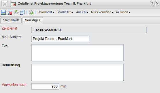 - Dokumenttyp: Dieses Element kennzeichnet den Dokumenttypen, auf dem dieser Zeitdienst basiert und ermöglicht die korrekte Zuordnung einer entsprechenden Option. Ist dieses Feld nicht gefüllt, stehen als Optionen die Standard-Zeitdienste (Erinnerungen, Statusmeldungen…) zur Verfügung.