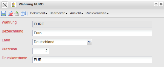 Die Maske Währungen verwaltet die Währungen für das gesamte System. Die Währung wird einem Land zugeordnet und enthält Informationen zur Anzahl der Nachkommastellen und der Druckkonstanten der Währung. Die Währungen werden für die Kostenerfassung und die Komponenten des Fakturamoduls benötigt.