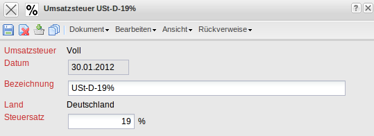• Land: Dieses Feld ordnet einem Land die Umsatzsteuer zu, die dort Gültigkeit hat. Die Länder können in den Collections definiert und geändert werden. Im System wird die Umsatzsteuer vorbelegt (siehe auch Dokumenttyp Konfiguration).