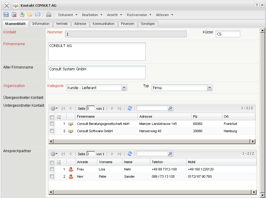 - Untergeordneter Kontakt: Dieses Element beinhaltet eine Auflistung aller zugeordneten untergeordneten Kontakte. Nach der Definition von “Tochterunternehmen”, werden diese automatisch im übergeordneten Kontakt übertragen.