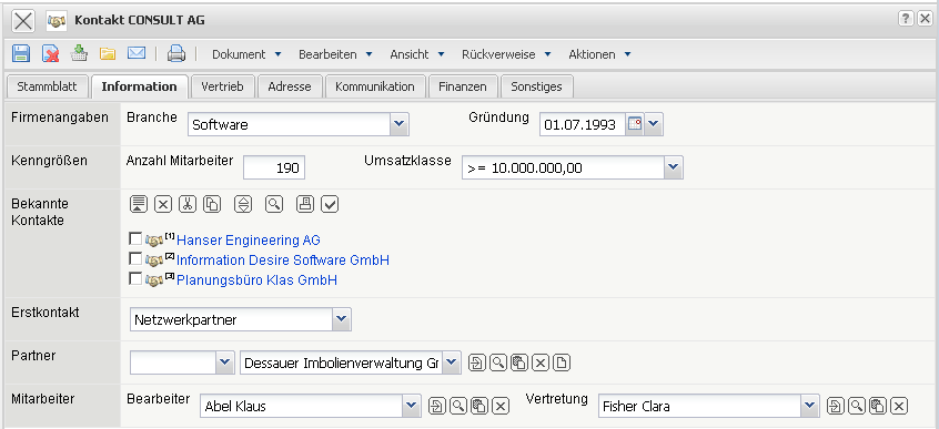- Bearbeiter und Vertretung: Hier können die Kundenbetreuer eingegeben werden. Diese® Mitarbeiter sind für den Kontakt verantwortlich.