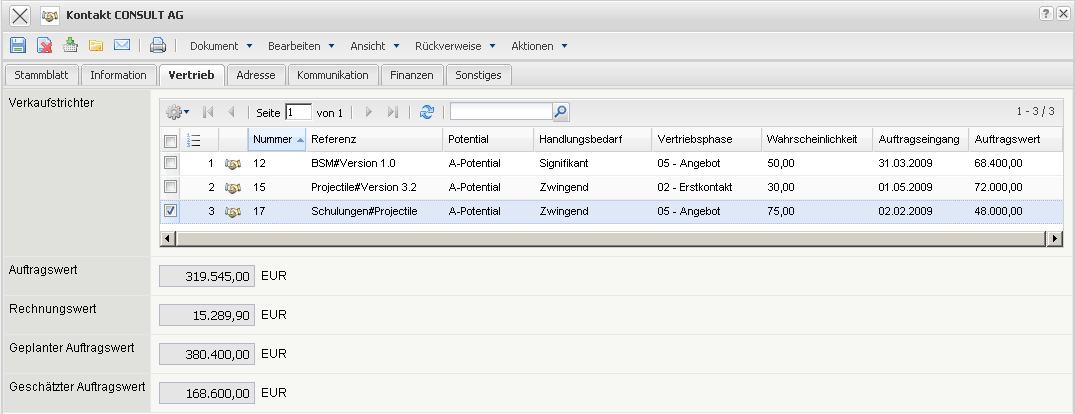 - Auftragswert und Rechnungswert: Hier werden vom System der Auftragswert als Summe aller Auftragsbestätigungen und der Rechnungswert als Summe aller fertiggestellten Rechnungen aller Projekte des Kundens aufgelistet.