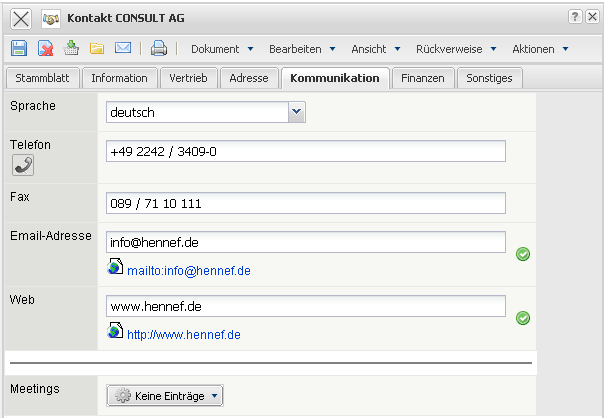 - Meetings: Dieses Feld definiert und notiert Termine die bereits mit dem Kunden durchgeführt wurden.