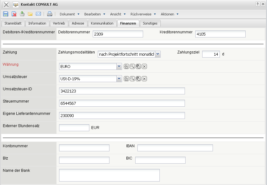 - Bankverbindung (Kontonummer, BLZ, Name der Bank, IBAN, BIC): Diese Felder kennzeichnen die Bankverbindung des Kunden.