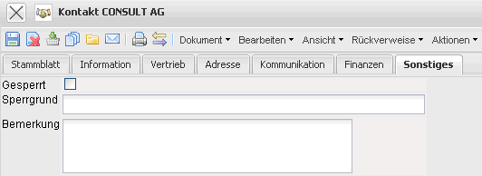 - Gesperrt, Sperrgrund: Dieses Häkchen kann gesetzt werden, wenn der Kunde nicht mehr als Auftraggeber für ein Projekt herangezogen werden soll. Der Grund für die Sperrung (Insolvenz, Zahlungsmoral, …) kann im nächsten Feld eingetragen werden.