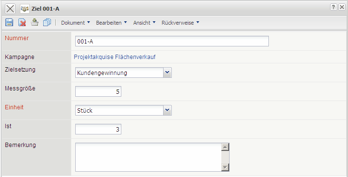 Die Maske Kampagnenziel verwaltet die Ziele der Marketing- und Vertriebskampagnen im System. Hier werden u.a. die Zielsetzung, die Messgröße und Einheit sowie die Istwerte hinterlegt.
