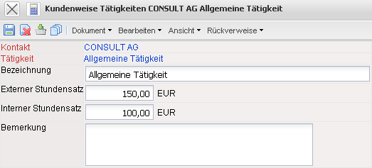 Die Maske Kundenweise Tätigkeiten verwaltet die Be- und Verrechnungssätze (pro Stunde), die abweichend von den Standardsätzen (in der Regel definiert in den Tätigkeiten) für einen bestimmten Kunden verwendet werden.