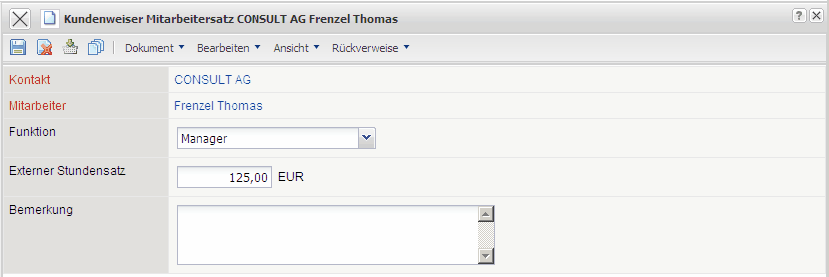 Die Maske Kundenweiser Mitarbeitersatz verwaltet die Externen Stundensätze, die abweichend von den Standardsätzen (in der Regel definiert in den Tätigkeiten) für einen bestimmten Kunden verwendet werden.
