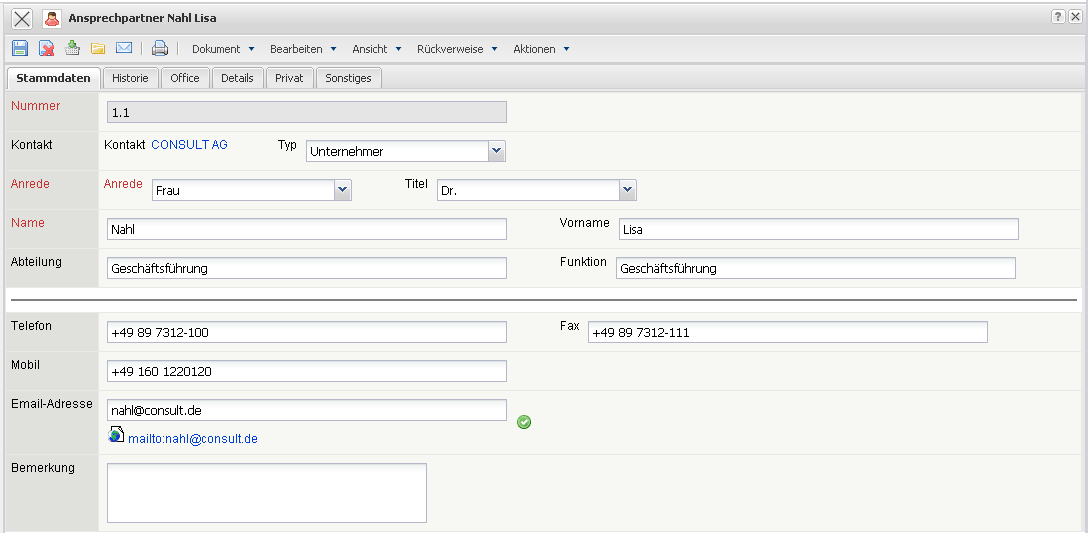 - Office: Dieses Feld kennzeichnet das Büro für die Ansprechpartner beim Kontakt.