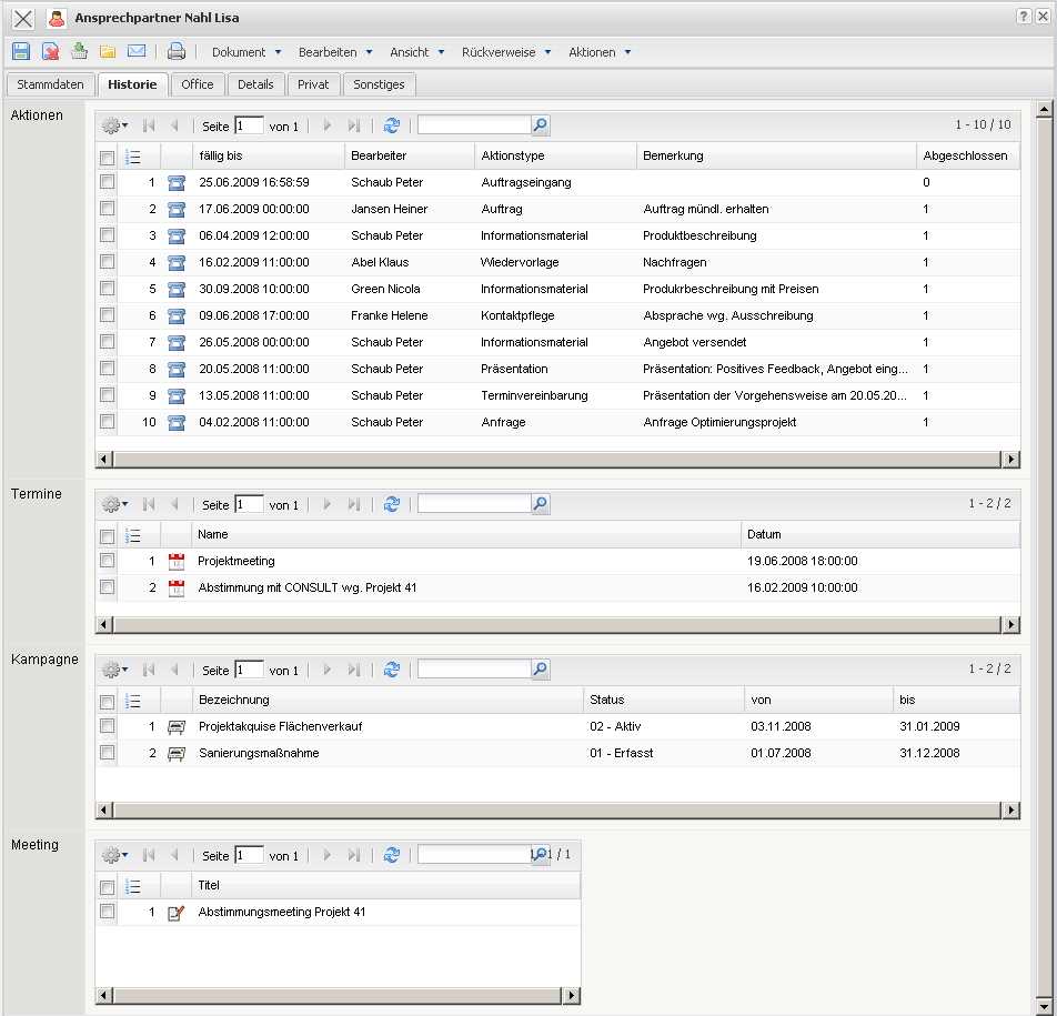 - Aktionen: Dieses Element beinhaltet alle zugeordneten Aktionen zum Ansprechpartner. Die Aktionen werden in der Maske Aktion verwaltet.