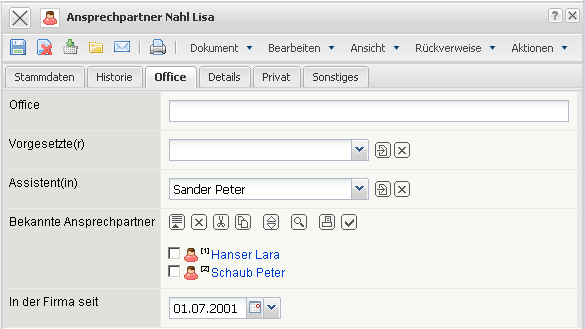 - Vorgesetzte/r und Assistent/in: Hier können Vorgesetzte und der Assistenten des Ansprechpartners hinterlegt werden.
