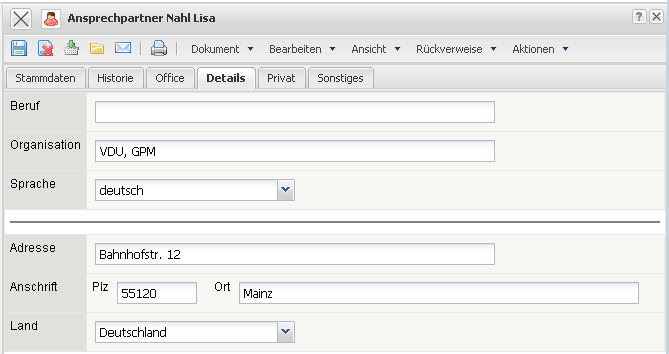 - Beruf und Organisation: Hier können Beruf und Organisationen des Ansprechpartners hinterlegt werden.