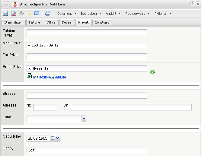 - Geburtstag und Hobby: Hier können weitere private Informationen zum Ansprechpartner hinterlegt werden.