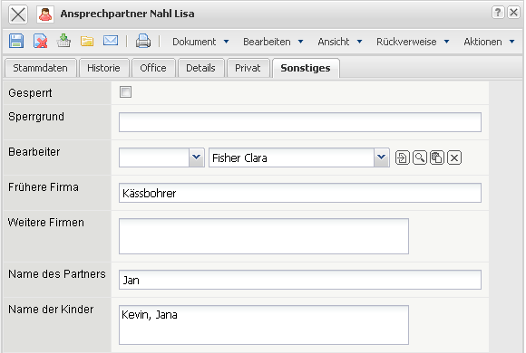 - Frühere und weitere Firma: Hier werden ggf. weitere und ehemalige Firmen des Ansprechpartners eingetragen.