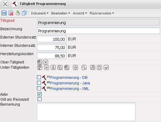 Die Maske Tätigkeit verwaltet alle Tätigkeiten für die Projektabwicklung. Jeder definierten Tätigkeit kann ein externer und zwei interne Tätigkeitssätze (auf Basis von Stunden) zugeordnet werden. Die Berechnungssätze werden für die Kalkulation, Angebots- und Rechnungsstellung herangezogen. Die Verrechnungssätze und Herstellungskosten werden für interne Projekte und die Ermittlung der tatsächlichen Projektkosten benötigt. Diese Tätigkeiten bilden die Basis für die Kosten- und Preisfindung und darüber hinaus bilden sie die Grundlage für das Vorschlagswesen (siehe auch Arbeitspakete und Mitarbeiterauswertung). Die Tätigkeiten können in Ober- und Untertätigkeiten gegliedert werden.
