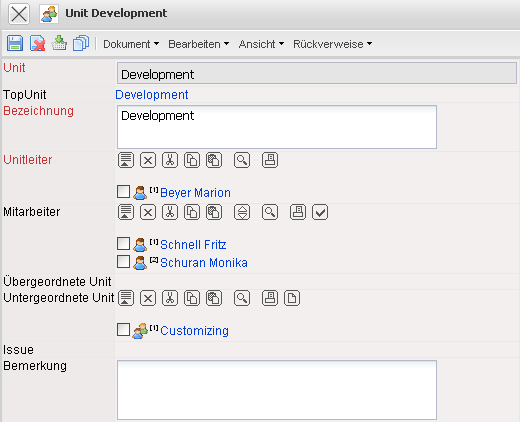 Die Maske Unit verwaltet die Organisationsstrukturen der Firma. Hier werden in der Regel Abteilungen und Unterabteilungen (ggf. auch Standorte) mit den zugehörigen Mitarbeitern definiert. Diese Units werden (analog zu den Projekten) als Basis für das lokale Berechtigungssystem verwendet (siehe auch Administrationsleitfaden). Darüber hinaus können sie für die Zuordnung von Projekten zu Organisationseinheiten genutzt werden.