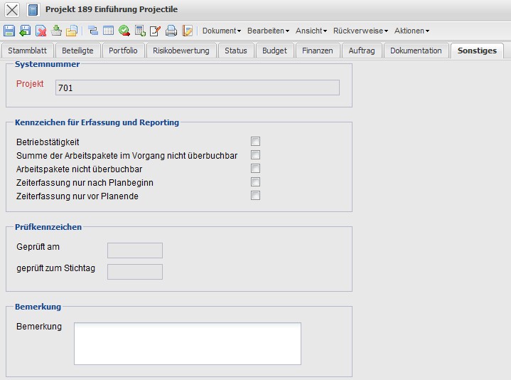 - Bemerkung: Dieses Feld ermöglicht die Eingabe von Bemerkungen zum Projekt.