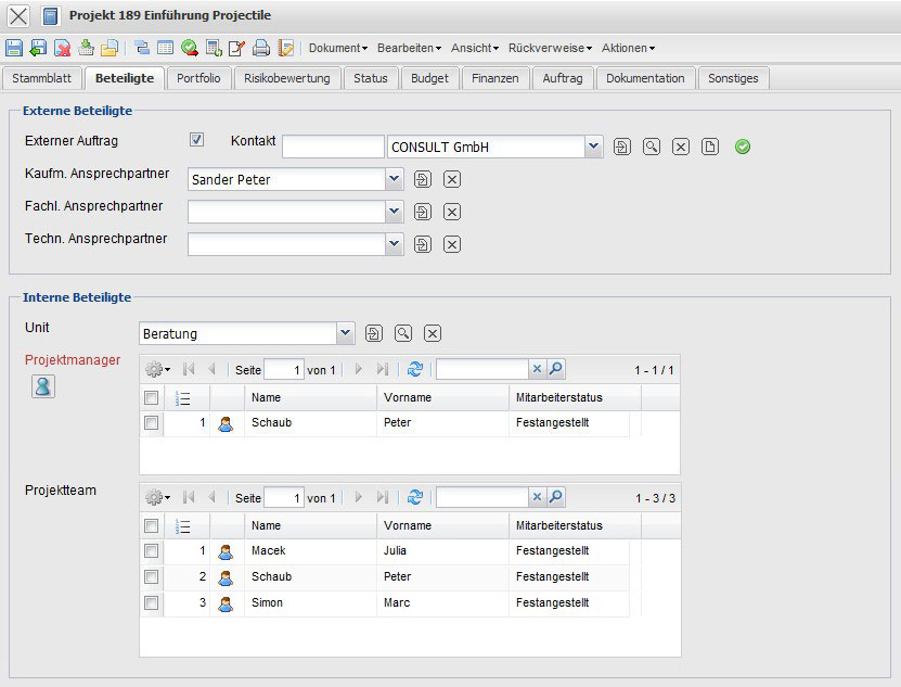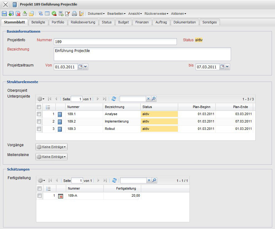 In der Maske werden alle relevanten Informationen über das Projekt und seine Beziehung zum Oberprojekt (seine hierarchische Stellung also in der Projektstruktur), die Aktivität, Kunden, Währung, Projektstundensatz, Projektleiter, die nötigen Qualifikationen, die Zuordnung zum Projektteam, Kostenstelle und Anlagedaten definiert. Darüber hinaus werden hier die Planwerte für Projektbeginn und -ende, das Projektbudget, die Projektkosten und die Projektdauer dem Projektverantwortlichen angezeigt.