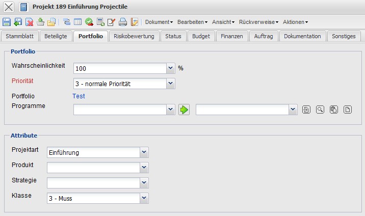 - Produkt, Strategie, Klasse: Diese Felder klassifizieren, ähnlich wie die Projektart, das Projekt und sind Selektionskriterien für das Portfoliomanagement und die Projektauswertungen.