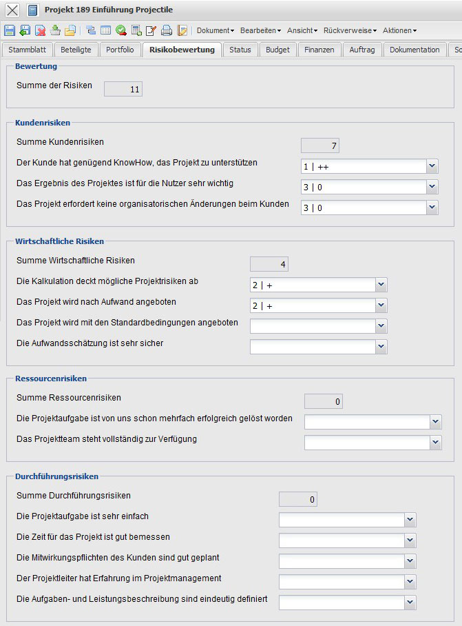 - Risiko erstellen: Diese Aktion öffnet ein neues Dokument “Risiko”. Hierüber können Risiken definiert werden, die die Umsetzung des Projektes beeinflussen können.
