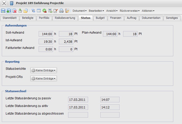 - Status: Dieses Feld kennzeichnet, ob das Projekt aktiv, passiv oder abgeschlossen ist. Bei Neuanlage eines Projektes wird dieses Feld vom System mit Passiv vorbelegt. Weitere Ausprägungen (unterbrochen, abgebrochen) können vom Administrator definiert werden.