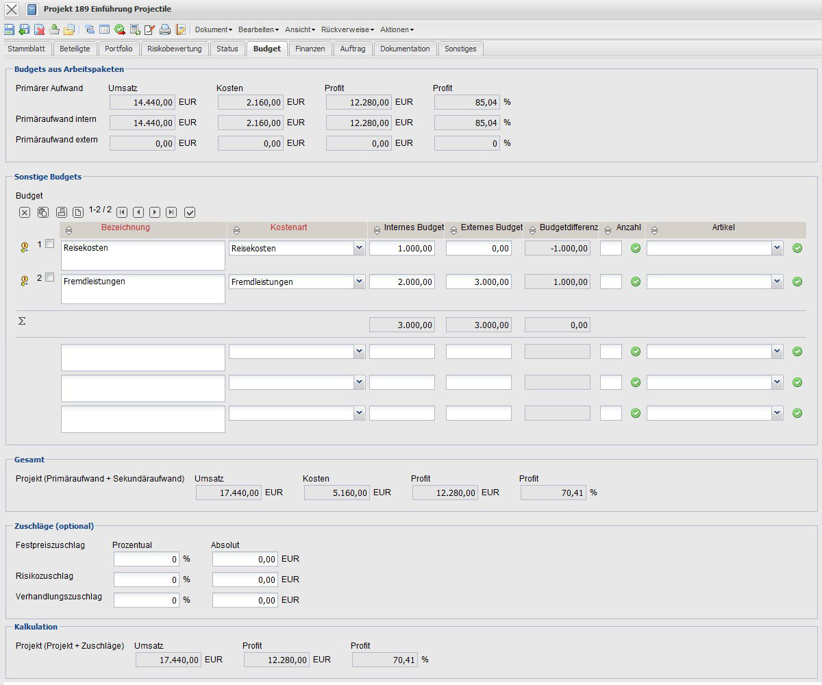 - Budget: Dieses Element beinhaltet eine Auflistung aller zugeordneten Budgetposten. Hier können tabellarisch die sonstigen Budgets (Sekundäraufwände) hinterlegt werden.