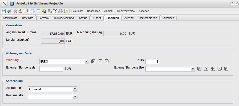 - Rechnungsbetrag: Dieser Wert beinhaltet die Nettobeträge der übernommenen Rechnungen zum definierten Projekt. Die Rechnungen können mit Hilfe der Aktion “Rechnung erstellen” generiert werden und werden mit Hilfe der Masken Rechnung und Rechnungsposition verwaltet.