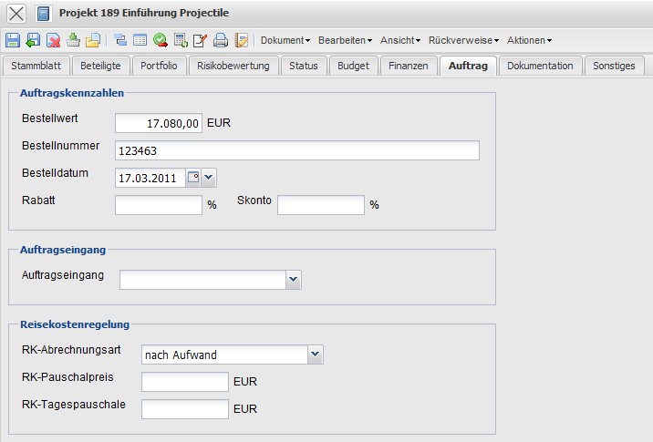 - Bestellnummer, Bestelldatum: Hier kann die Bestellnummer und das Bestelldatum des Projektes eingegeben werden. Diese Bestelldaten können für den Rechnungsausdruck verwendet werden. Die Bestellnummer und das Bestelldatum werden vom System automatisch übertragen, wenn eine Auftragsbestätigung definiert übernommen wird.