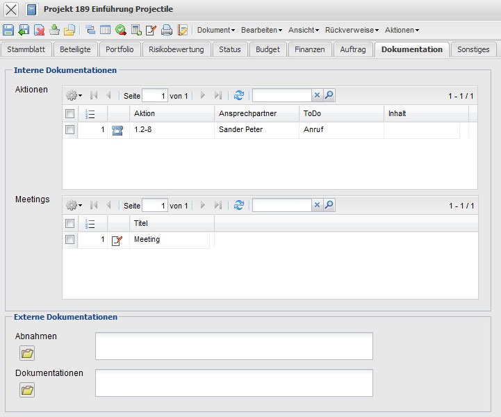 - Abnahmen: In diesem Feld kann man die Abnahmen eines Projektes eintragen und als Ordner hinterlegen.