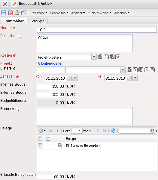 Die Maske Budget verwaltet die projektbezogenen Budgets im System. Hier kann ein Budgetposten über eine beliebige Kostenart für ein Projekt definiert werden. Hierbei können interne Budgets (also Kostenvorgaben/Plankosten) und/oder externe Budgets (Posten, die projektbezogen weiterbelastet werden sollen, wie Reise- oder Fahrtkosten) definiert werden. Diese Budgetposten werden im System mit den erfassten Kosten verglichen, als Basis unterschiedlicher Plan/Ist-Vergleiche.