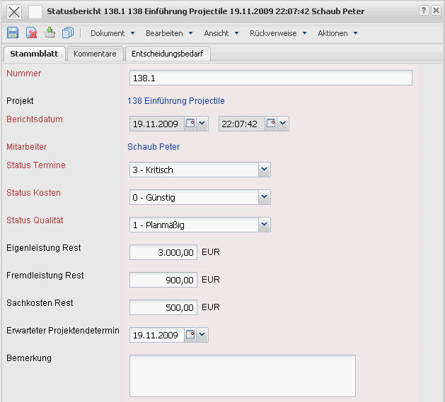 • Projekt: In diesem Feld wird das Projekt, das am Anfang des angelegten Statusberichts ausgewählt wurde, angezeigt.