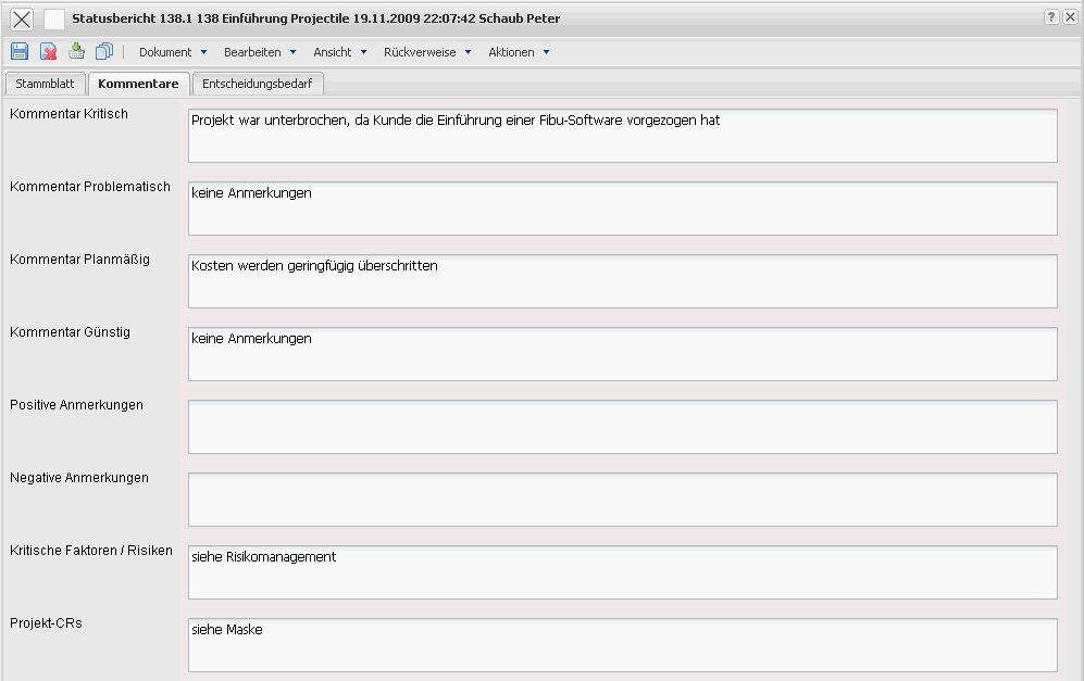 • Kritische Faktoren/Risiken: In diesen Textfelder kann der Projektleiter kritische Faktoren oder Risiken hinterlegen, welche im Projekt auftreten könnten oder schon aufgetreten sind.