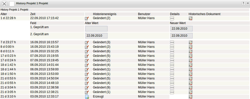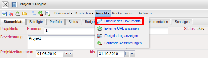 Die Historie protokolliert alle Änderungen eines Datensatzes. Dazu gehört das Anlegen neuer Datensätze, die Veränderungen auf Feldebene und das Löschen von Datensätzen. Die Daten der Historie werden in der Projectile-Datenbank verwaltet und enden mit den Löschvorgang, d.h., wenn ein Dokument nach dem Löschen mit Hilfe der Papierkorb-Funktionalität wieder hergestellt wird, ist die ursprüngliche Historie des Dokumentes nicht mehr vorhanden.