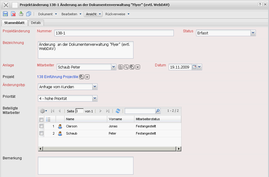 - Mitarbeiter: - Hier wird vom System der zuständige Mitarbeiter der Projektänderung vorbelegt. Die Mitarbeiter werden in der Maske Mitarbeiter verwaltet.