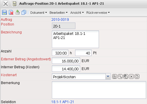 Die Maske Auftragsbestätigungsposition beinhaltet den Verweis auf die Auftragsbestätigung sowie Informationen über die Position, Bezeichnung, Anzahl der Stunden oder Einheiten, den externen und internen Betrag der Auftragsbestätigung und die Kostenart. Der Auftragswert bestimmt sich aus den Beträgen der einzelnen Positionen.