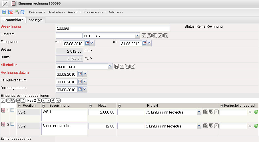 Die Maske Eingangsrechnung verwaltet die Eingangsrechnungen der Partner bzw. Lieferanten für ein bestimmtes Projekt. Die Fremdrechnungen beinhalten Informationen über Lieferant, Status der Rechnung, Leistungsintervall, Nettobetrag, Gesamtbetrag, Ersteller und Datum der Rechnungsstellung.
