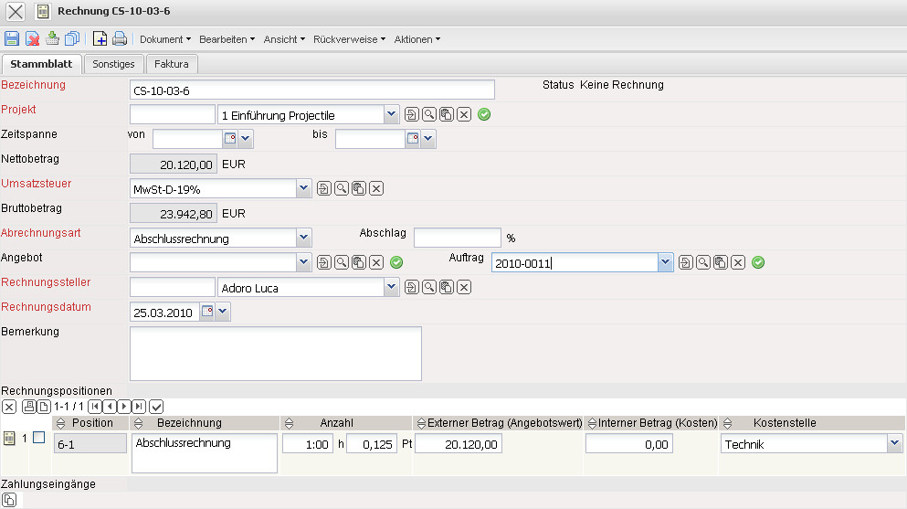 Die Maske Rechnung realisiert die Rechnungsstellung im System. Die (Ausgangs-)Rechnung beinhaltet u.a. Informationen über Rechnungsbezeichnung, Projekt, Ersteller, Status der Rechnung, Leistungsintervall, Nettobetrag, Umsatzsteuer, Gesamtbetrag, Skonto, Abrechnungsart und Rechnungsdatum.