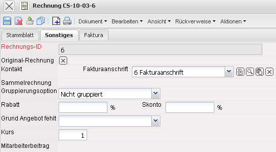 - Sammelrechnung: Dieses Feld enthält bei Sammelrechnungen einen entsprechenden Verweis auf die Sammelrechnung (nicht in der Standardversion enthalten).
