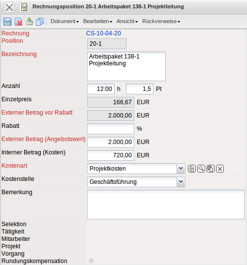 - Selektion: Dieses Feld verweist auf das übernommene Dokument der Rechnungsposition (Arbeitspaket, Beleg, Fahrt, Reise, Fremdkosten, Fremdrechnung).