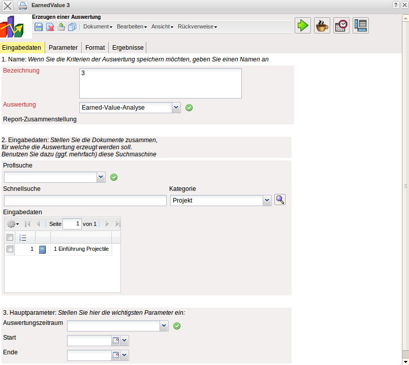 Die Auswertung Earned-Value-Analyse listet für ein Projekt über beliebige Perioden die Plan- und Istaufwände (in Stunden oder Personentagen) sowie den Fertigstellungsgrad (Fortschritt zur Vorperiode) ab. Aus diesen Daten wird der sogenannte Earned Value und weitere Kennzahlen (BCWS, ACWP und BCWP) bestimmt. Das besondere an der Earned Value Analyse ist, dass neben den Plan und den Ist-Werten als dritte Größe der gleichen Einheit der BCWP zur Projektbeurteilung herangezogen wird.