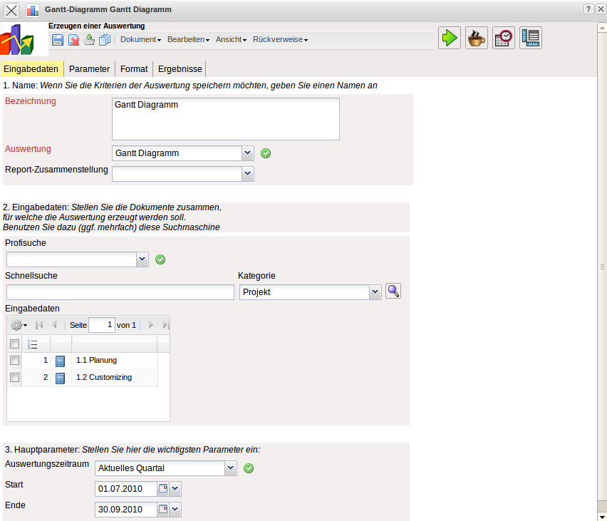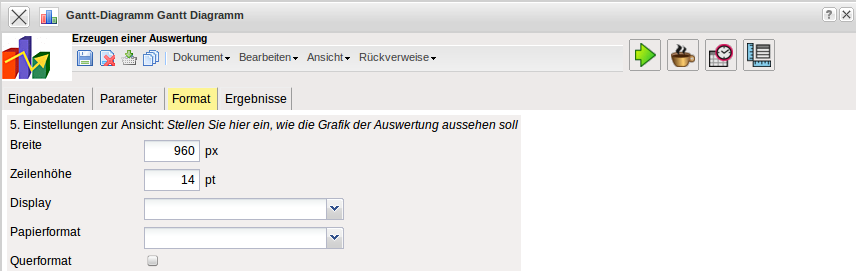 - Periode: Diese Auswahlbox gibt den Zeitraum an, indem das Gantt-Diagramm ausgeführt werden soll.