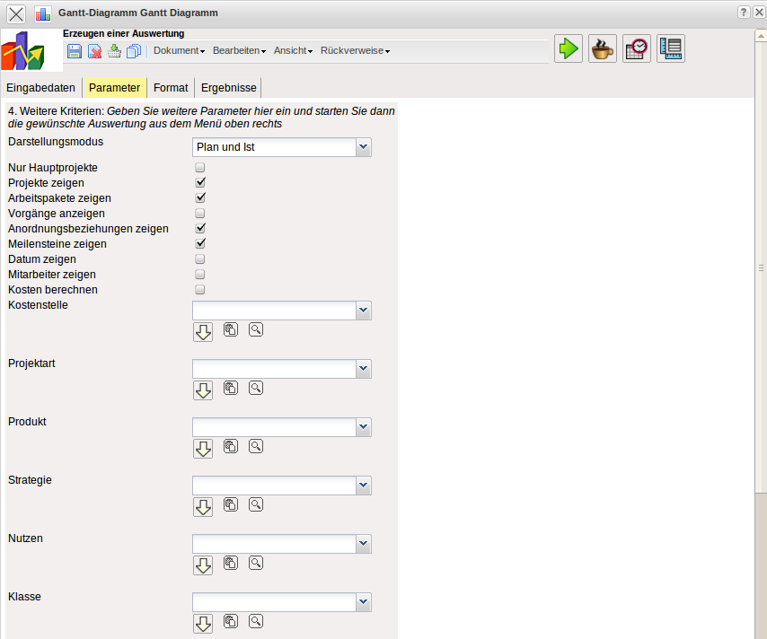 - Produkt, Strategie, Nutzen, Klasse: In diesen Auswahlboxen können als Selektionskritierium Produkt, Strategie, Nutzen und Klasse gewählt werden. Diese Selektionen beziehen sich jeweils auf die gleichnamigen Felder im Projekt.