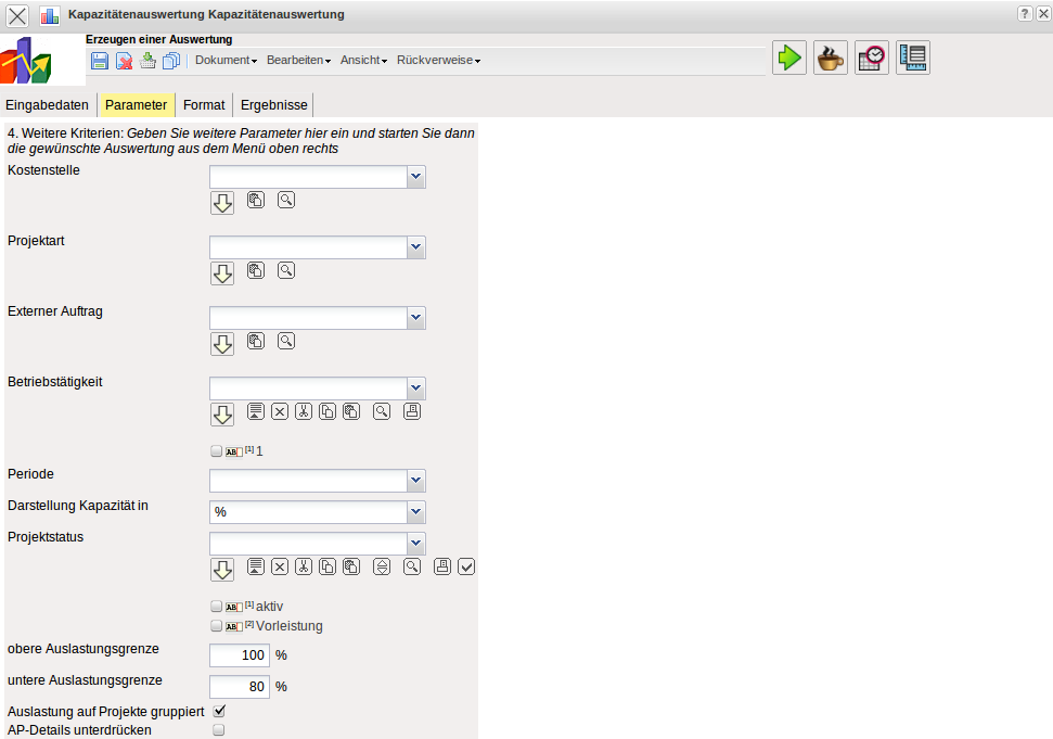 - Auswertung: Die Kapazitätsauswertung beinhaltet folgende Auswertungen: