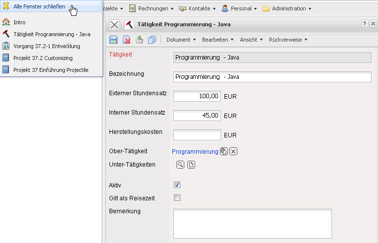 Im oberen Teil des Arbeitsbereiches befindet sich eine Auflistung der bereits geöffneten Masken - der Fenstermanager. Die aufgelisteten Masken können direkt über diese Liste geöffnet werden. Im Beispiel befinden sich der Arbeitsbereich (Intro) und die Datensätze für die Projektsuche, Tätigkeit, das Projekt 58 Projekt JB08 .3- 2 Entwicklung, das Projekt 59 Projekt Einführung Projectile und der Kalender.