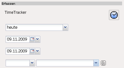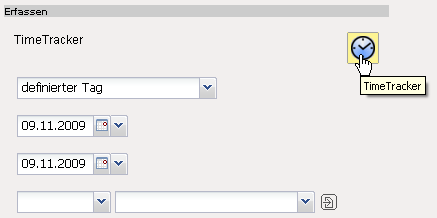 Anmerkung: Die Auswahlbox unter dem zweiten Datumsfeld ist für die Erfassung auf andere Mitarbeiter und nur für Poweruser verfügbar (Einstellung in der TimeTracker_Default).