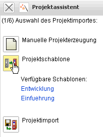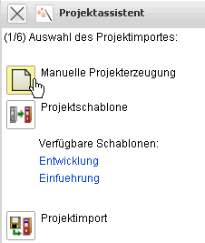 Im Dialog kann entweder ein Projekt manuell definiert, mit Hilfe von Projektschablonen oder des Importassistenten generiert werden.