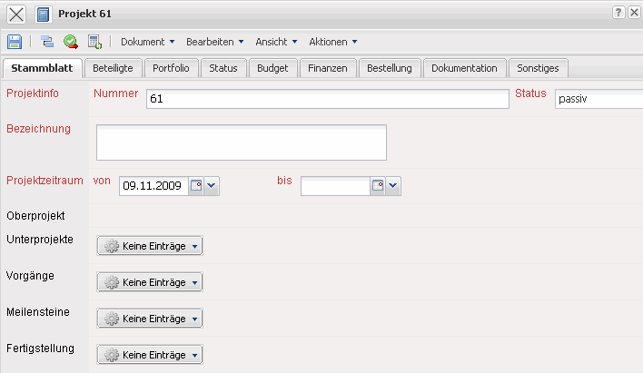 Bei Auswahl der manuellen Projekterzeugung öffnet sich eine neue Maske vom Typ Projekt mit den Vorbelegungen.