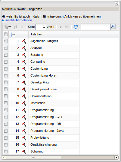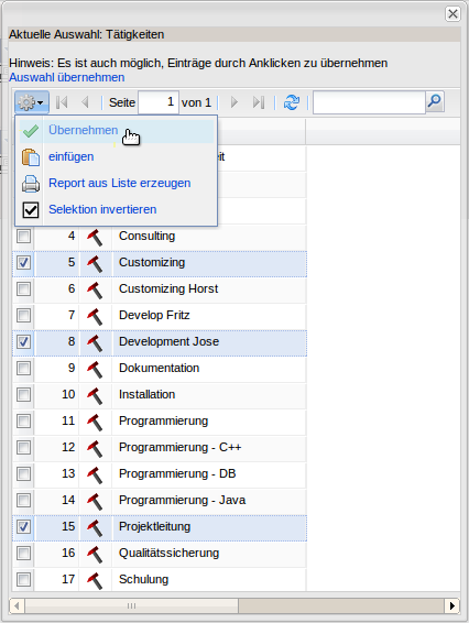 Durch die Auswahl der Tätigkeiten und Betätigen des Buttons “Auswählen und zurück”, werden die markierten Tätigkeiten …